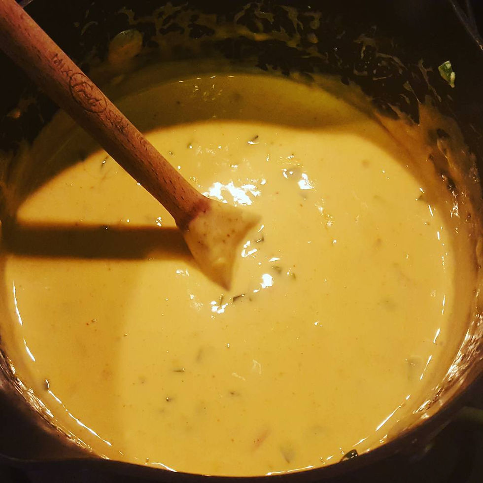 Add the cans of chiles, salsa verde and additional cream a little at a time until you reach desired consistency.. Keep on low heat until serving.